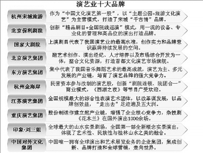 2012年,杭州宋城旅游和北京保利劇院的營業收入均超5億元,分別排在全國演出機構年營業收入第一名和第二名,而第三名的國家大劇院2012年營業收入為4.2億元,全國排在前十名的演出機構年營業收入都在1億元以上,中國演藝巨頭正在形成。