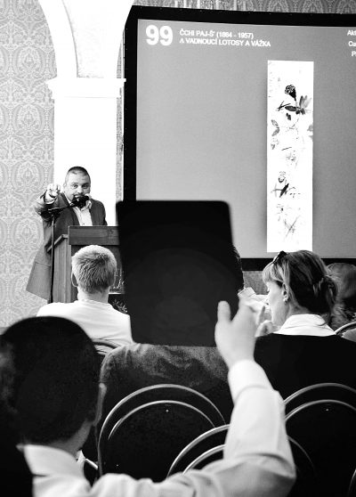 21日,捷克首都布拉格舉辦2013年夏季中國藝術品和古董拍賣會。本次拍賣會涵蓋了中國自東周、漢唐以來陶瓷、青銅器、玉器、石刻、繪畫、木雕、象牙雕等藝術品和古董共146件,尤其是齊白石、徐悲鴻等繪畫藝術大師和名家的作品爭奪異常激烈。一幅由捷克漢學家私人收藏的齊白石90歲時創作的彩色掛軸《紅蓮蜻蜓圖》,經過數十輪激烈競拍,最終以870萬克朗(1美元約合20克朗)收槌。近年來,捷克多次舉辦中國藝術品和古董拍賣會,引起世界許多藝術品藏家的極大興趣。圖為齊白石《紅蓮蜻蜓圖》拍賣現場。(光明日報駐布拉格記者 夏茂盛攝)