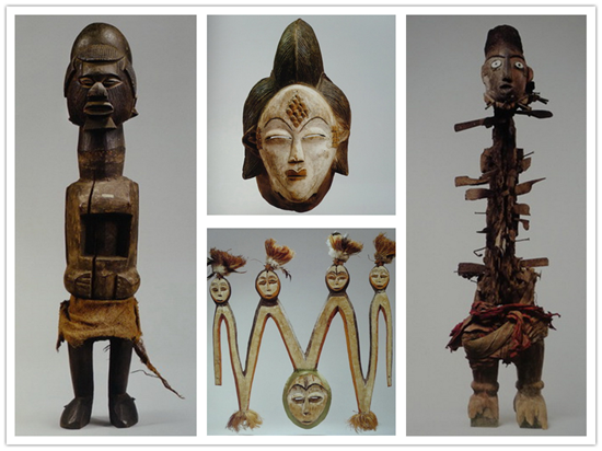 左:未填放靈力物質的男子雕像。 中上:普努族面具。中下:奎勒族帶角面具。右:巫術偶像(即帶釘子的法力偶像)。