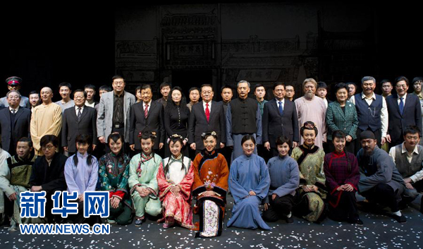 12月23日,中共中央政治局常委李長春在北京國家大劇院觀看國家大劇院推出的原創(chuàng)話劇《王府井》。這是演出結(jié)束后,李長春與演職人員合影。新華社記者黃敬文攝