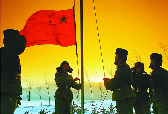 就是在這樣的環(huán)境中,戰(zhàn)友們在哨所前豎起了一根旗桿,無論風(fēng)雨彌漫,還是大雨磅礴,每當(dāng)朝陽升起的時候,全哨所有的戰(zhàn)友全部在這里舉行升國旗的儀式,并唱著那首豪邁的歌《我把太陽迎進祖國》。我被戰(zhàn)友們趴冰臥雪、站崗巡邏、以苦為樂的奉獻精神感染著,鏡頭一直聚焦在這里。進入新世紀(jì),解放軍畫報社組織“跨世紀(jì)的中國周邊行”大型攝影報道活動,我第四次來到這里,記錄下軍民合力,興邊固防,哨所環(huán)境改變的情景。“東方第一哨”有了可視電話,哨兵們喝上了井水,各種環(huán)境都得到了改善。