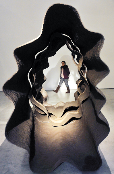 2月18日至3月18日,一場名為“周流·復歌”的陶藝展在臺北舉辦。展出的32件作品,大致以“大單元”與“小單元”兩種型態呈現。“大單元”的作品以單一或成雙的群聚方式展現,有著類似海底植物或巨石陣的神秘特質,加上光影與空間虛實相映的對照,讓現場氛圍顯現出具有劇場特質的詩性空間。而“小單元”聚合成如蜂窩、燕巢、牡蠣、珊瑚等的視覺景觀。圖為參觀者在欣賞陶藝作品。 新華社發 吳景騰 攝