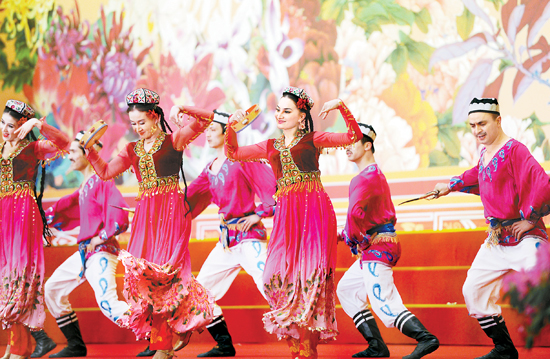 三月十日,十一屆全國人大五次會議、全國政協十一屆五次會議少數民族代表、委員茶話會在北京人民大會堂舉行。這是演員在表演節目。 新華社記者 馬占成 攝
