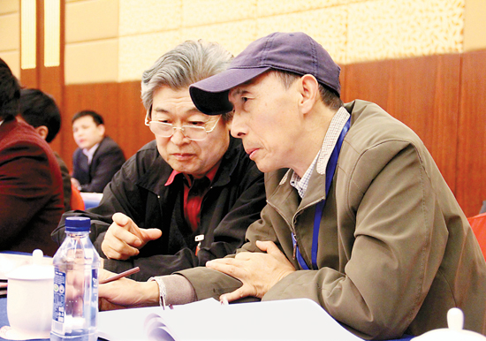 楊力舟委員(左)與韓書力委員交流提案。中國藝術(shù)報 張悅 王春梅 攝