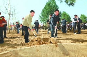 4月14日,中共中央政治局委員、北京市委書記劉淇,中共中央政治局委員、書記處書記、中宣部部長劉云山和千名首都文化界人士來到昌平區北七家鎮海鶄落村,揮鍬培土,提水灌溉,共同植下首都文化林。本報記者 李繼輝攝