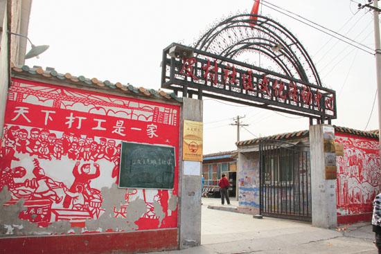 皮村社區(qū)文化活動(dòng)中心大門(mén),打工文化藝術(shù)博物館、工友圖書(shū)館、工友影院、新工人劇場(chǎng)和同心互惠公益商店都在此院內(nèi)。中國(guó)藝術(shù)報(bào)記者 喬燕冰 攝
