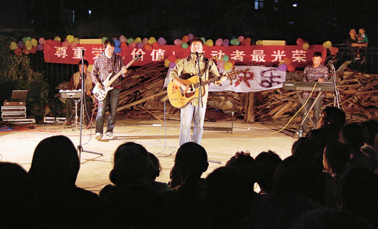 新工人藝術(shù)團(tuán)為社區(qū)工友義演活動(dòng)現(xiàn)場(chǎng),孫恒(前排右一)與許多(前排左一)在為大家演唱。圖片由北京工友之家文化發(fā)展中心提供