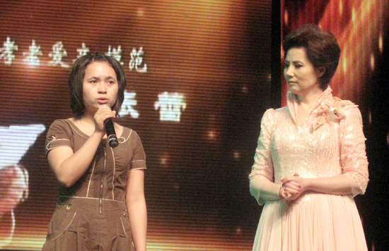 5月22日,“全國道德模范故事匯”基層巡演2012福建福州專場中,第三屆全國孝老愛親道德模范張蕾接受主持人采訪。劉紅英 攝