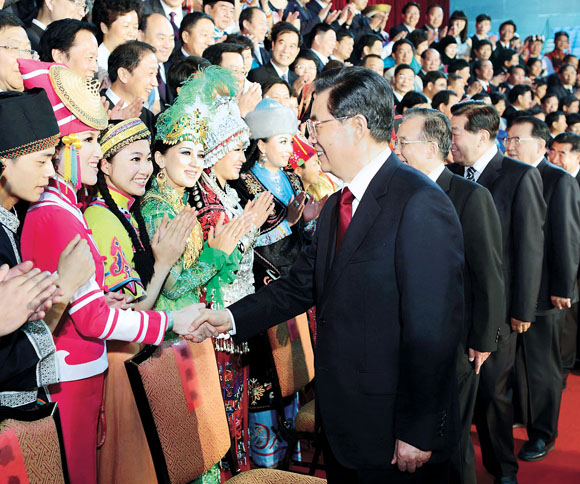6月12日,第四屆全國少數(shù)民族文藝會演在北京國家體育館隆重開幕。胡錦濤、溫家寶、賈慶林、李長春等出席開幕式文藝晚會。演出開始前,胡錦濤等會見了參加會演的各少數(shù)民族演職人員代表。新華社發(fā)