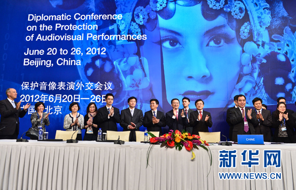 6月26日,《視聽表演北京條約》在京締結(jié)。“北京條約”的誕生,標(biāo)志著談判了近20年的視聽表演者版權(quán)保護(hù)的國際新條約終于修成正果。隨著“北京條約”的締結(jié),由世界知識產(chǎn)權(quán)組織舉辦,中國國家版權(quán)局、北京市人民政府承辦的保護(hù)音像表演外交會議落下帷幕。本次會議是世界知識產(chǎn)權(quán)組織近16年來在版權(quán)領(lǐng)域召開的首個外交大會,也是新中國成立以來首次承辦涉及版權(quán)條約締結(jié)的外交會議。150多個國家、40多個國際組織的700多名代表齊聚北京,共商音像表演保護(hù)大計。新華社記者 李文 攝