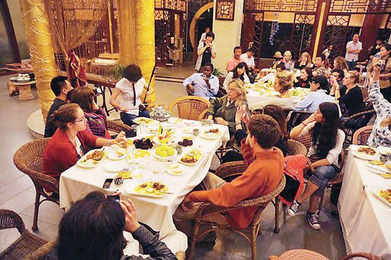平?jīng)鍪形穆?lián)、平?jīng)龀绻琵S,為這次活動(dòng)在住宿交通飲食各方面,做了精心安排,他們邀請(qǐng)了本地能講英文的學(xué)生全程陪同。圖為當(dāng)?shù)貙W(xué)生在晚餐后表演才藝。中外學(xué)生聯(lián)歡氣氛融洽。