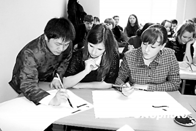 孔子學院教師向俄羅斯學生傳授中國書法。中新社發