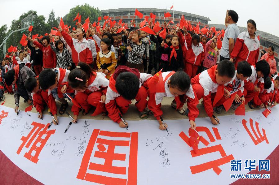 9月17日,在安徽省亳州市譙城區(qū)薛閣小學(xué),學(xué)生們在“勿忘國恥 愛我中華”橫幅上簽名。當(dāng)日,安徽省亳州市譙城區(qū)薛閣小學(xué)舉行了解“九一八”事變的主題教育活動。 新華社發(fā)(張延林 攝)