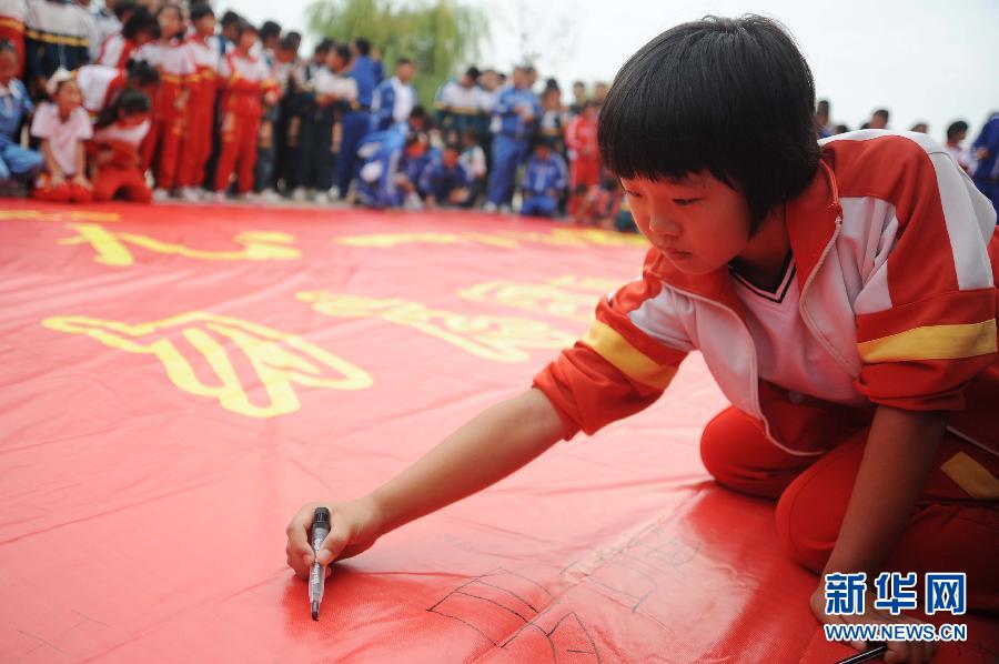 9月17日,山東省乳山市徐家學(xué)校學(xué)生在“勿忘國恥、愛我中華”的巨型宣傳條幅上簽名。當(dāng)日,乳山市徐家學(xué)校邀請參加抗戰(zhàn)的退伍老兵和駐地邊防部隊的現(xiàn)役軍人走進學(xué)校,通過給學(xué)生講解歷史知識、宣誓等形式,開展主題為“勿忘國恥、愛我中華”的愛國主義教育活動。新華社發(fā)(劉國賢 攝)