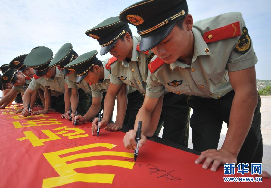 9月17日,在浙江省臺州市溫嶺石塘鎮(zhèn),邊防官兵在印有“勿忘歷史、振興中華”字樣的橫幅上簽名?!熬乓话恕笔伦儽l(fā)81周年紀念日前夕,臺州市溫嶺邊防大隊開展以“勿忘歷史、振興中華”為主題的愛國主義教育活動。 新華社發(fā)(郟策攝)