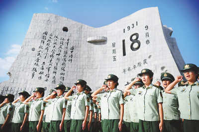 “九一八”歷史博物館近日迎來眾多參觀者,人們在這里緬懷先烈、銘記歷史。武警遼寧邊防總隊組織新入警的100名大學(xué)生警官在這里進行了一場以“勿忘歷史 奮發(fā)圖強”為主題的愛國主義教育活動。圖為大學(xué)生警官中的黨員在“殘歷碑”前重溫入黨誓詞。 人民日報記者 辛陽攝