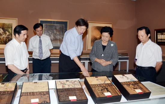 9月17日下午,中共中央政治局委員、國務委員劉延東來到北京畫院,饒有興致地參觀了正在這里舉辦的“四駕馬車——馮驥才的繪畫、文學、文化遺產保護與教育”展覽。圖為劉延東在王文章、李前光、馮驥才、羅楊等陪同下參觀展覽。中國文藝網 張志勇 攝