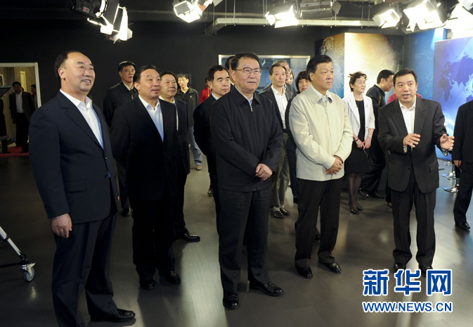 9月29日,中共中央政治局常委李長春來到經濟日報社,看望慰問報社全體員工,并向全國新聞工作者致以節日問候和良好祝愿。這是李長春走進中國經濟網演播廳,觀看新聞制作和信息傳播視頻演示。 新華社記者 張鐸 攝