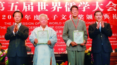本屆世界儒學(xué)大會(huì)開(kāi)幕式上,還舉行了2012年度“孔子文化獎(jiǎng)”頒獎(jiǎng)典禮。“孔子文化獎(jiǎng)”是由文化部和山東省人民政府旨在鼓勵(lì)世界范圍內(nèi)的儒學(xué)研究者、研究機(jī)構(gòu)深入研究孔子思想文化精髓而設(shè)立的國(guó)際獎(jiǎng)項(xiàng)。中央民族大學(xué)教授、著名哲學(xué)史家、宗教學(xué)家、國(guó)際儒學(xué)聯(lián)合會(huì)理事牟鐘鑒和韓國(guó)大學(xué)教育發(fā)源地、韓國(guó)儒教總部——韓國(guó)成均館榮膺本年度“孔子文化獎(jiǎng)”。