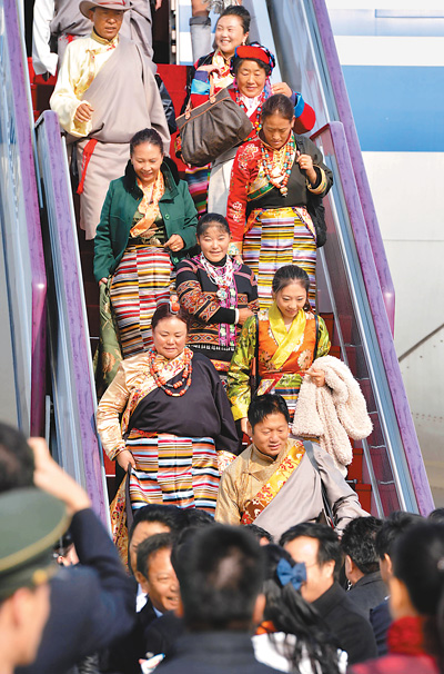 來自西藏的黨的十八大代表乘機(jī)抵達(dá)北京首都國際機(jī)場。新華社記者 王曄 攝