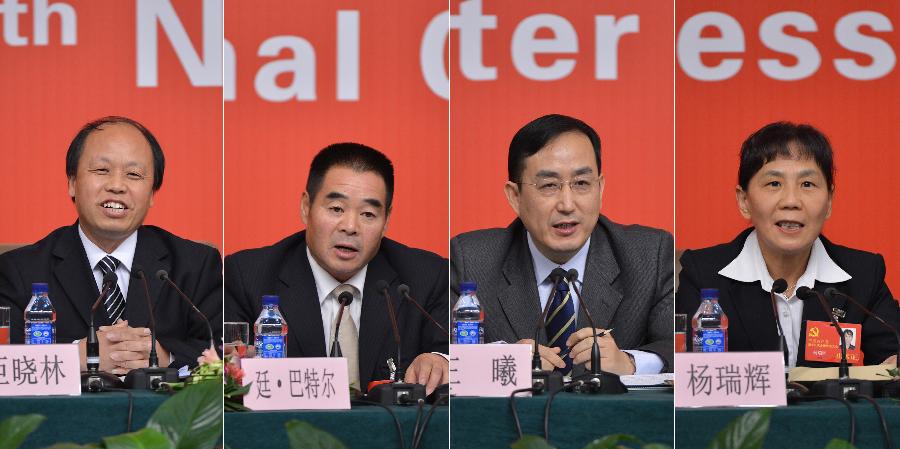 11月12日,十八大代表巨曉林、廷·巴特爾、王曦、楊瑞輝(從左至右)在集體采訪活動上。