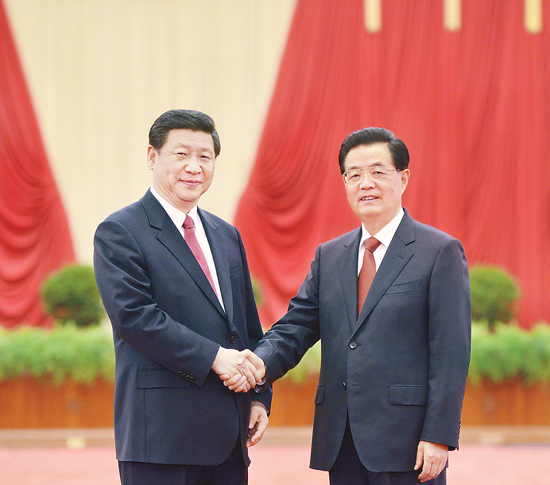 11月15日,國(guó)家主席胡錦濤,新當(dāng)選的中共中央總書記、中共中央軍委主席習(xí)近平等領(lǐng)導(dǎo)同志在北京人民大會(huì)堂親切會(huì)見(jiàn)出席黨的十八大代表、特邀代表和列席人員并發(fā)表重要講話。這是胡錦濤和習(xí)近平親切握手。 新華社發(fā)