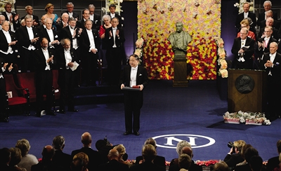 隨后,每個諾貝爾獎項評選委員會的代表分別介紹了獲獎者的成就并依次邀請獲獎者上臺從國王手中領獎。頒獎順序依次為物理學、化學、生物及醫學、文學、最后為經濟學獎。諾貝爾和平獎頒獎典禮稍早已于挪威舉行。