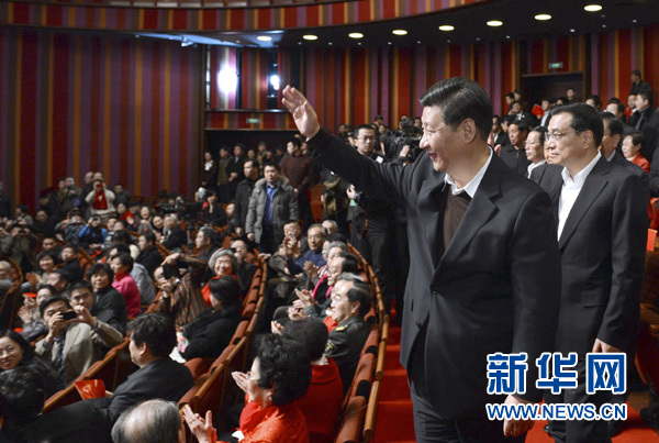12月30日晚,2013年新年京劇晚會在北京國家大劇院舉行。黨和國家領導人習近平、李克強、張德江、俞正聲、劉云山、王岐山、張高麗,與首都近千名群眾一起觀看演出,喜迎新年的到來。這是習近平向演員和觀眾招手致意。新華社記者 馬占成 攝