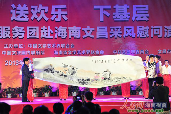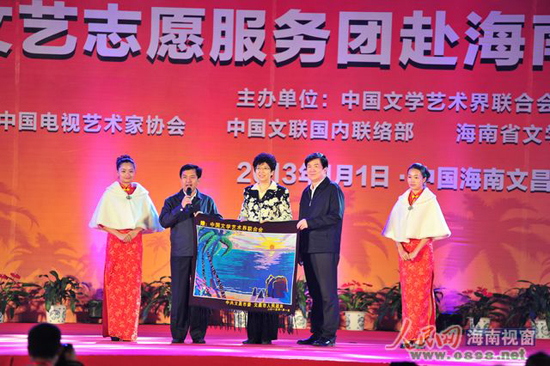 在慰問演出前,中國文聯(lián)和文昌市領(lǐng)導(dǎo)分別致詞,并互贈送紀(jì)念品。