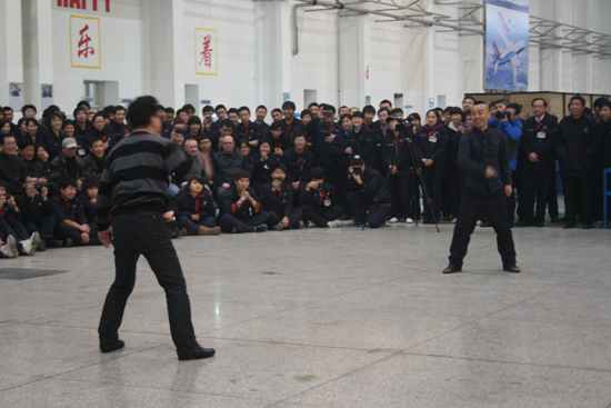 在沈飛民機演出之前,慰問演出團還派出小分隊趕至沈飛民機下屬39廠進行演出,就在機器聲隆隆的車間里,周圍是機器及各種飛機部件,職工們圍成半圓,或坐或站,熱切地看著這些曾經只在電視上謀面過的藝術家們的表演,在他們休息的空隙里爭先恐后地和他們合影留念。藝術家們也激情澎湃,沒有后臺,就以一塊錫板為鏡再練習一遍動作。吳正丹告訴記者,由于水泥地不夠安全,她和魏葆華合演的雜技《東方的天鵝》本來想只做幾個動作,然而一到車間,尤其是這個具有特殊意義的地方,兩人備受感染,毫不猶豫地換上單薄的演出服,成功地完成了整場演出。