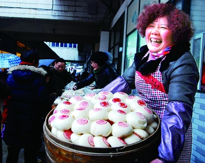 2月7日,在浙江省建德市新安江農(nóng)貿(mào)市場里,店主朱汝珍趕制了兩萬多個印著紅色“喜”字的饅頭、荷葉包等傳統(tǒng)的鄉(xiāng)土過年食品。寧文武攝/光明圖片