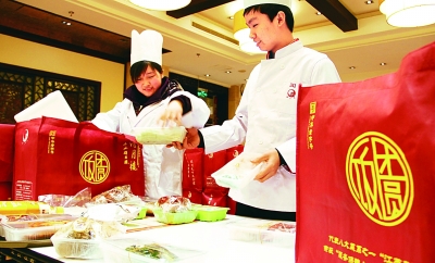 2月7日,蘇州某飯店服務(wù)員為“打包年夜飯”配菜。新華社發(fā) 朱桂根攝
