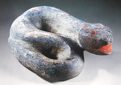 在以蛇為主要圖像的古代文物中,常見(jiàn)的還有下述兩項(xiàng):其一是代表北方的玄武,其形象是下龜上蛇交纏在一起,最遲在漢代,蛇龜交纏的玄武圖像,已與代表東方的青龍、西方的白虎、南方的朱雀,合稱“四神”,用以代表四方。后來(lái)在道教中,蛇龜相纏的玄武,又成為北方真武大帝的神將。今日武當(dāng)還保存有明代鑄成的玄武銅像。其二是十二時(shí)(十二辰)中代表巳時(shí)的動(dòng)物為蛇,在隋唐時(shí)期的十二辰陶俑中,常把它塑造成蛇首人身的形貌。
