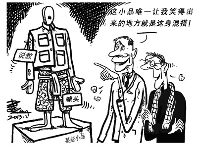 當(dāng)然,光說(shuō)理容易,光逗樂(lè)也不太難,既講道理又把人笑翻的確不是容易的事,非要有點(diǎn)兒思想家的頭腦、哲學(xué)家的智慧、辭賦家的語(yǔ)言、過(guò)來(lái)人的滄桑,還要再加上幽默大師的天賦才成。這樣的要求,對(duì)于相聲小品來(lái)說(shuō)是有點(diǎn)高。就拿同時(shí)呈現(xiàn)于晚會(huì)的姊妹藝術(shù)——歌曲和舞蹈來(lái)說(shuō)吧,但凡詞曲過(guò)得去、演唱者不走調(diào),或者編舞不太蹩腳、舞者不太糟糕,觀眾就能坐住,不至于挑三揀四。相比之下,相聲小品的運(yùn)氣就沒(méi)那么好了,如果不能高級(jí)地逗人樂(lè),被會(huì)被指責(zé),讓人坐不住。
