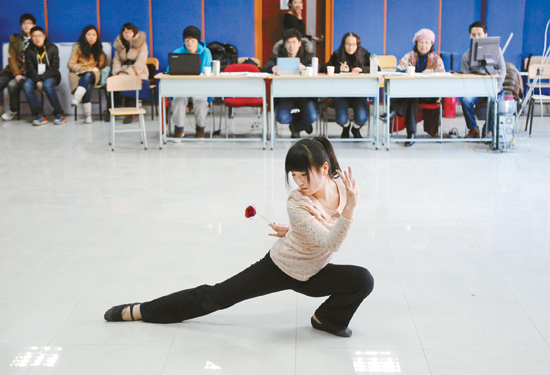 日前,在中國傳媒大學南廣學院,報考演藝學院的一名考生在形體項目的考試中表演舞蹈。