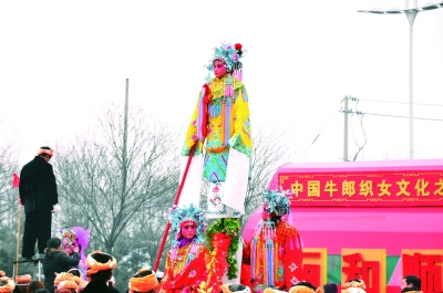 不一會(huì)兒,農(nóng)民高蹺隊(duì)向人們扭了過來,演繹著豬八戒背媳婦、媒婆、傻公子等,扮相滑稽;接著“劃旱船”的走過來,瀟灑壯實(shí)的漢子拿著船槳,扶著彩色的船幫,翩翩起舞……人們爭相觀看,有的踩在凳子上引頸欣賞,有的父母扛著娃娃觀看,無不興致勃勃地陶醉其中。(本報(bào)記者 邢兆遠(yuǎn) 李建斌)