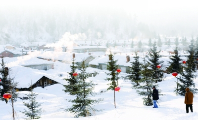 游客在雪鄉(xiāng)掛燈籠。程偉光攝