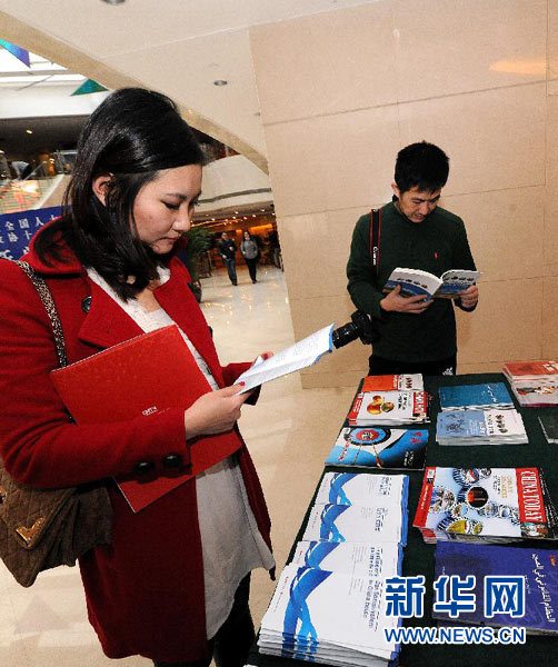 2月26日,兩名記者在新聞中心翻閱資料。當(dāng)日,設(shè)在北京梅地亞中心的2013年全國兩會(huì)新聞中心正式啟用,中心工作人員開始接待和安排中外記者采訪。 新華社記者 何俊昌 攝