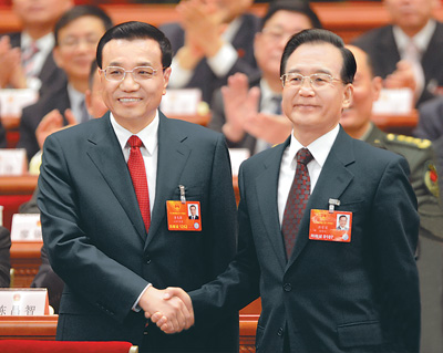 3月15日,十二屆全國人大一次會議在北京人民大會堂舉行第五次全體會議。會議經過投票表決,決定李克強為中華人民共和國國務院總理。這是溫家寶和李克強親切握手。