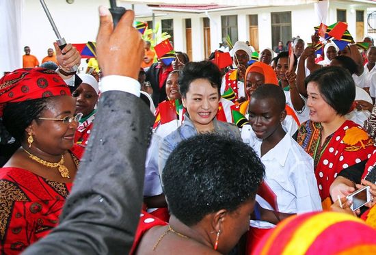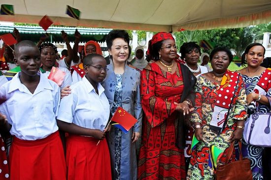 3月22日,坦桑尼亞,彭麗媛與在場(chǎng)的兒童和婦女合影