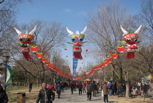 4月6日,在北京陶然亭公園內(nèi)東門(mén)主干道上空懸掛的3條身長(zhǎng)達(dá)120米的巨龍風(fēng)箏并排飛舞,中間龍身圖案是56個(gè)民族,兩側(cè)龍身是京劇臉譜,道路兩側(cè)一個(gè)個(gè)造型別致的風(fēng)箏造景奪人眼球。當(dāng)日,以“與風(fēng)共舞,沁游陶然”為主題的第二屆風(fēng)箏春花文化節(jié)在該園舉行,1300余只造型各異的風(fēng)箏在此展出。