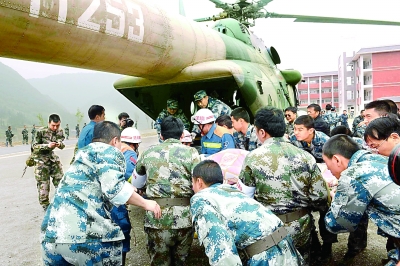 4月21日,蘆山縣太平鎮,救援隊員和路航團官兵從太平鎮中學操場護送孕婦上軍用直升機。CFP