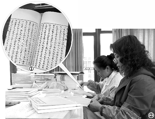 圖①:揚州書局再版的《四庫全書》部分樣書。 圖②:裝訂車間,工作人員正在完成線裝書成品前的最后工序。 人民日報記者 姚雪青攝 |