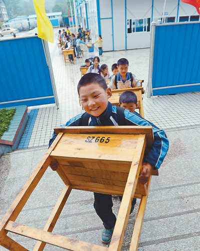 五月二十四日,四川省蘆山地震一個多月后,雅安市雨城區(qū)上里鎮(zhèn)中心學校的學生將課桌搬進加固后的綜合樓。
