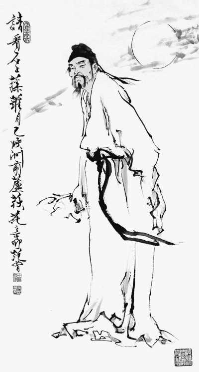 歲月的風(fēng)輕輕拂過,留下先知先賢的空谷足音。在墨跡斑斑的畫布背后,似乎有無數(shù)的身影在躍動,他們長袖舞動,衣袂飄飄,裹挾著數(shù)千年的煙云浩渺、風(fēng)雷激蕩。在這里,剛直不阿的鐘馗、清靜無為的老子、仙風(fēng)道骨的莊子、高標(biāo)自持的屈原、建安風(fēng)骨的曹操、倜儻風(fēng)流的李白、沉著雄渾的杜甫、慷慨悲涼的蘇東坡、疏淡峻逸的柳宗元、嬉笑怒罵的蒲松齡、豪放不羈的曹雪芹……恍然可見他們倜儻的身影,聽到他們朗朗的笑聲。毫無疑問,范曾在作畫之時,將自己也畫了進去,他忘不了成長中的青春恣肆、苦難中的堅韌不拔,也忘不了狹路相逢的寒霜、華山論劍的雄心。