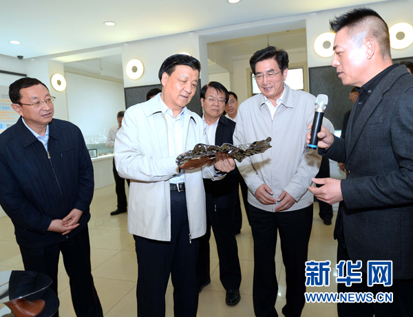 劉云山在北京工業設計創意產業基地觀看產品展示,聽取工作人員介紹企業發展情況。新華社記者 李濤 攝