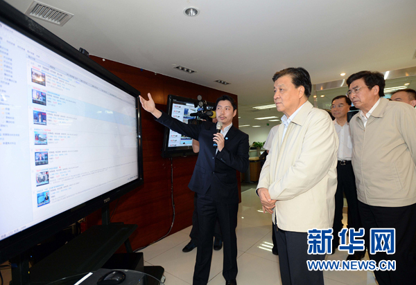 劉云山在中關村科技園雍和園天脈聚源傳媒科技有限公司聽取工作人員介紹企業文化創新與科技創新融合發展情況。新華社記者 李濤 攝