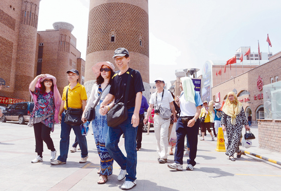 作為東西方文化的匯集點,烏魯木齊市正著力打造以7坊街文化產業(yè)園和新疆國際大巴扎為代表的文化景點,力求將新疆現代藝術和濃郁西域民族特色完美地展現出來,以文化聚人氣,以文化促溝通。圖為近日幾名來自臺灣的游客正在新疆國際大巴扎游覽觀光。新華社記者王菲 攝