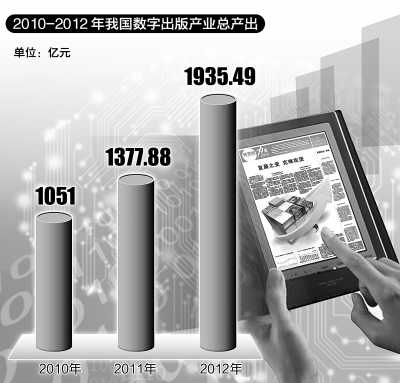 第五屆中國數字出版博覽會今天在京開幕。記者獲悉:2012年我國數字出版產業總產出達1935.49億元,比2011年增長40.47%,其中互聯網廣告、手機出版與網絡游戲依然占據收入榜前三位。同時,數字出版的多項標準制訂取得重大進展。
