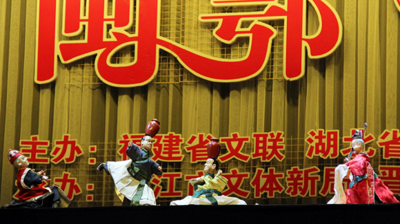 晉江市掌中木偶藝術保護傳承中心蔡美娜、陳代宮、林靜如等表演掌中木偶傳統劇目《大名府》。中國藝術報 喬燕冰/攝